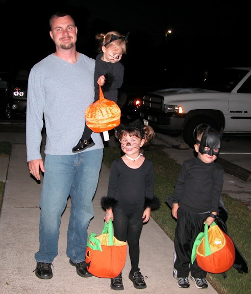 Here we are for Halloween 2005. The kids all dressed up in black. Madeline and Melanie were cats and Harrison was a bat. We walked around the neighborhood then went to the downtown Pflugerville halloween street festival.